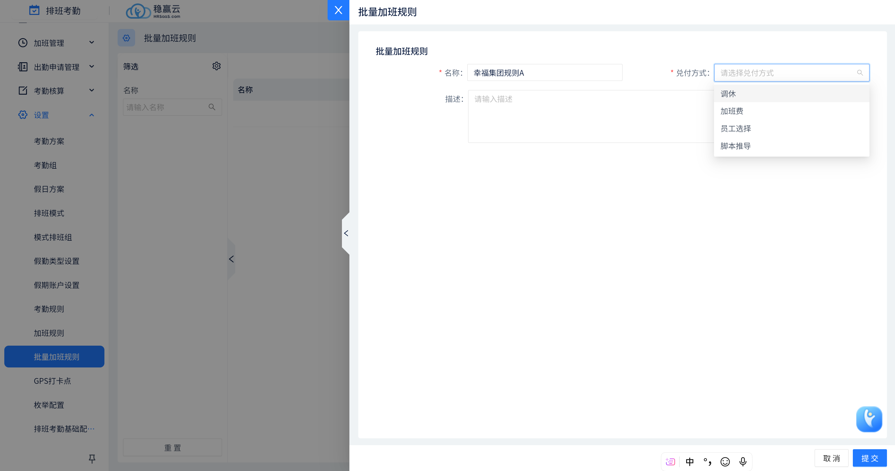 脚本推导:批量申请加班时,不显示加班兑付方式,后台默认根据脚本为每位申请人推导出相应兑付方式。