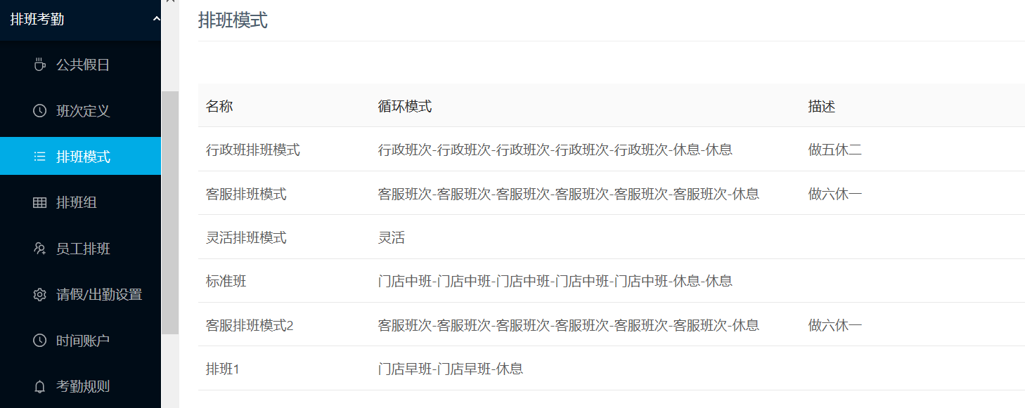 添加有固定模式的排班模式。如做五休二的行政排班模式,则循环天数为7天,每上班5天就休息2天。排班时将一直以这种模式进行循环。
