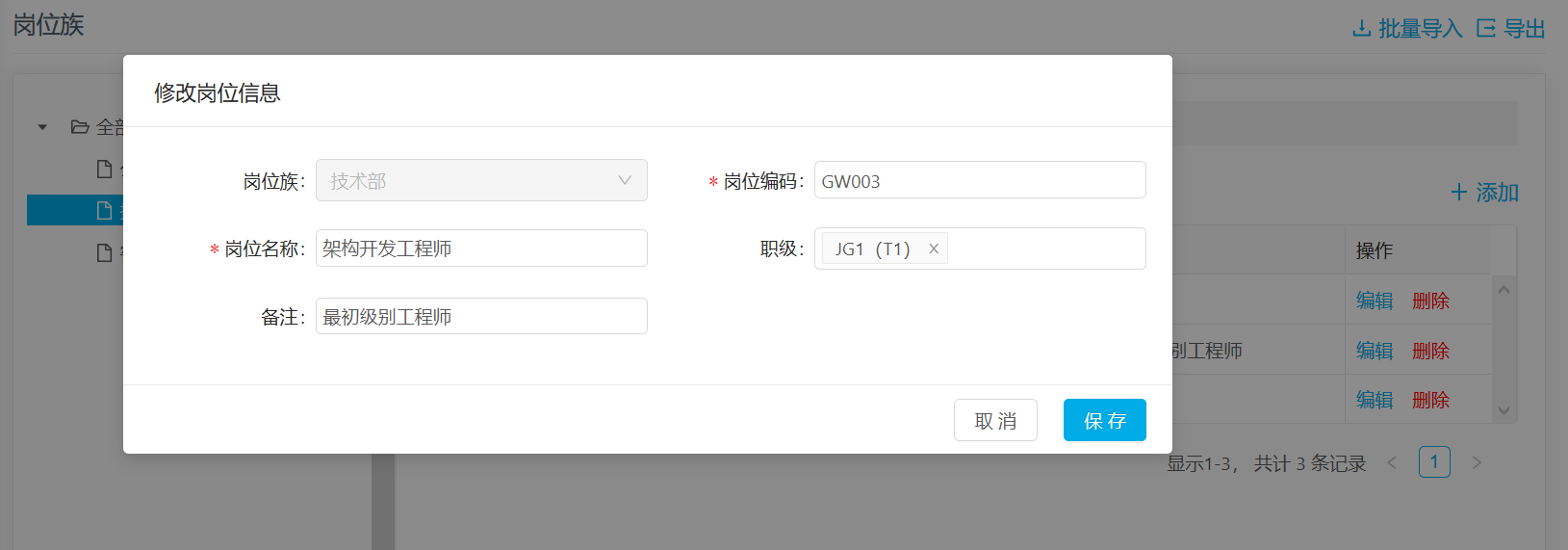 添加岗位族和其具体岗位信息。添加岗位信息时可选择对应的职级。