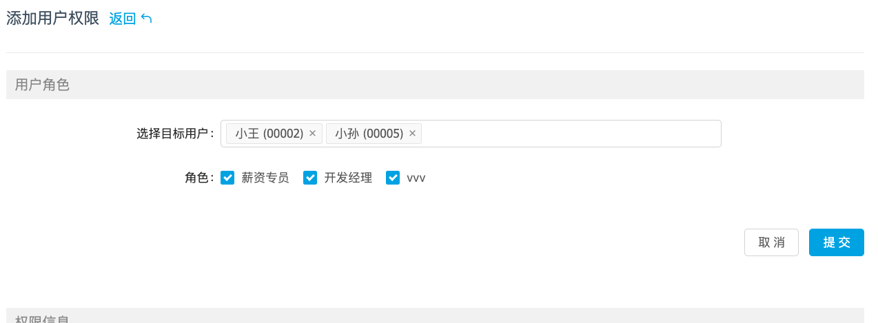 1、配置权限,可点击“分配权限”按钮,进入到,添加用户权限页面,通过分配角色给目标用户来批量的分配权限。(如下图所示:)