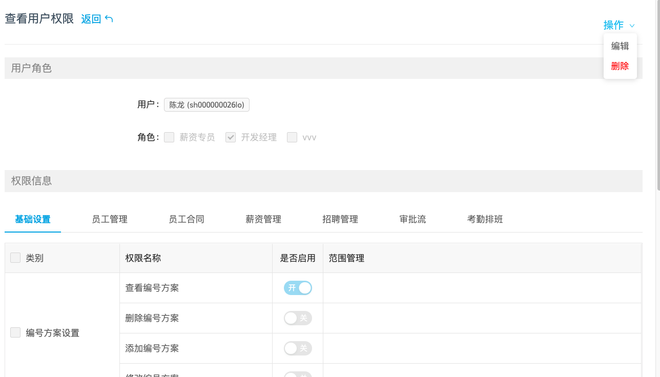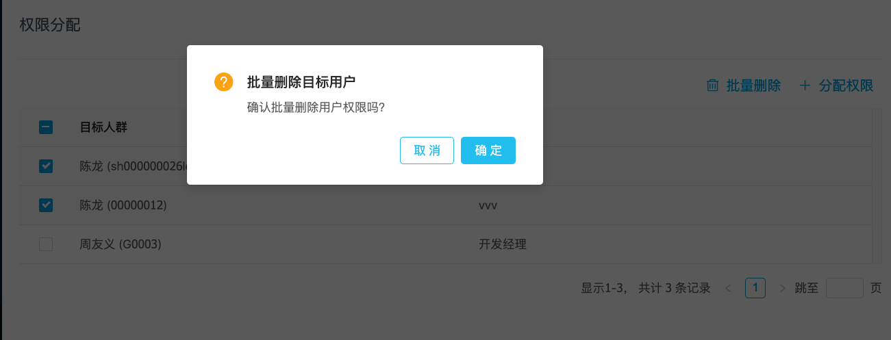 2、删除权限,支持批量删除和单个删除,批量删除可在权限分配列表也,勾选列表中的"勾选框",然后点击“批量删除”,可直接批量删除权限。单个删除,需进入到单个目标用户的详情页面,然后鼠标浮动到操作按钮上,点击“删除”。可实现单个删除权限。(如下图所示:)