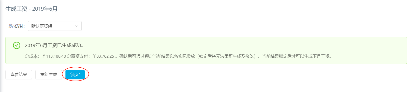 薪资管理 — 生成工资 页面,生成工资后,点击【锁定】。
