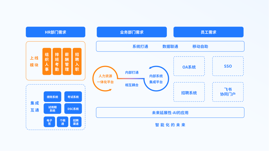 业务部门:解决多系统孤岛现象导致的各类人事业务数据无法及时同步的痛点,增强业务部门对员工的管理。